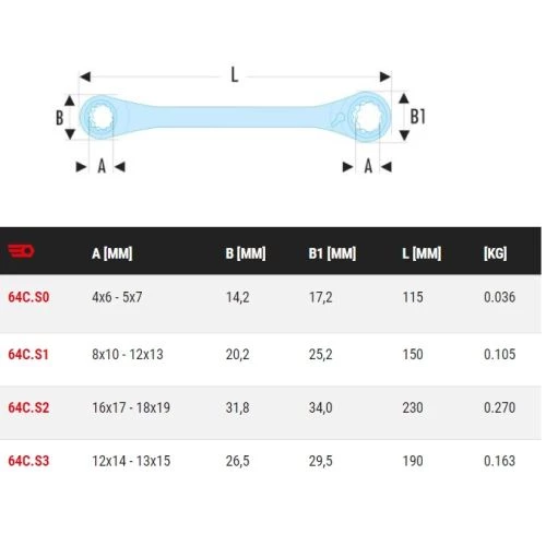 La clé polygonale à cliquet droite multi-ouverture métrique 64C est un outil polyvalent grâce aux 4 dimensions métriques par clé.
