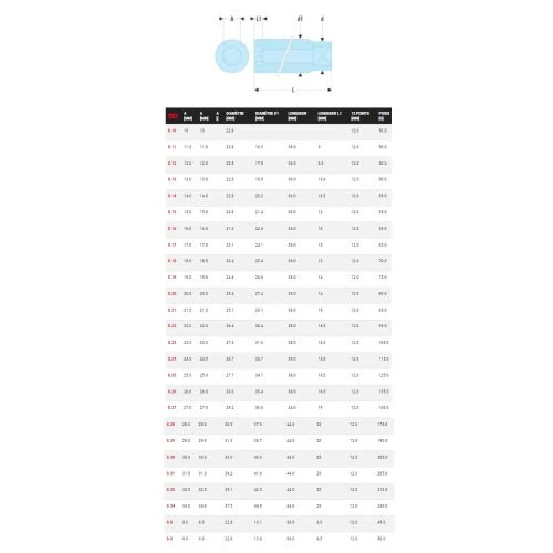 | Diamètre (mm) | 8, 9, 10, 11, 12, 13, 14, 15, 16, 17, 18, 19, 20, 21, 22, 23, 24, 25, 26, 27, 28, 29, 30, 31, 32, 34 |