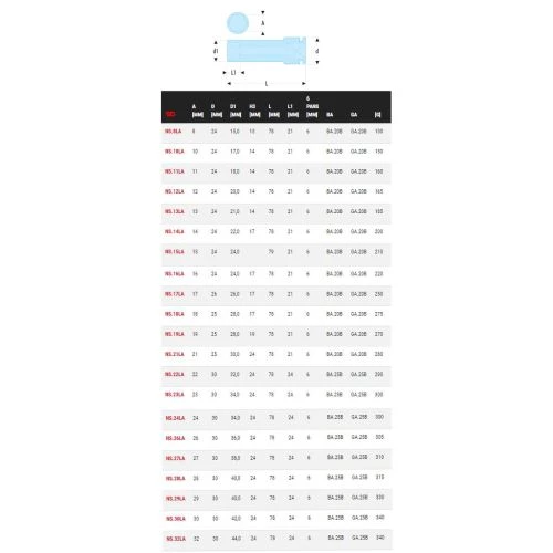| Diamètres douilles (mm) | 8, 10, 11, 12, 13, 14, 16, 17, 18, 19, 21, 22, 23, 24, 26, 27, 28, 29, 30, 32 |