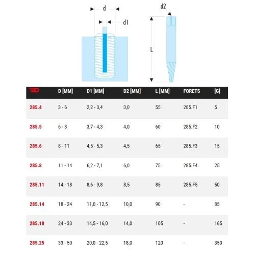 - Extraction après perçage d’un avant-trou à l’aide des forets coniques spécifiques Réf 285.F