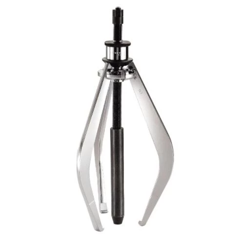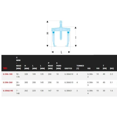 L’extracteur pour prise extérieure U.306 permet un montage en 2 ou 3 griffes et est possible de se transformer en extracteur à prise intérieure avec les griffes U.306G2 ou les griffes U.306G20. C’est un outil à griffes auto-serrantes par ressort de rappel qui permet de se tenir en position sur le roulement même s’il n’est pas en tension. De plus, pour plus de sécurité, les griffes sont bloquées en position sur le roulement à l’aide d’une molette. Cet extracteur U.306 est également doté d’une vis à tête fusible dont une goupille se cisaille en cas de dépassement du couple admissible.